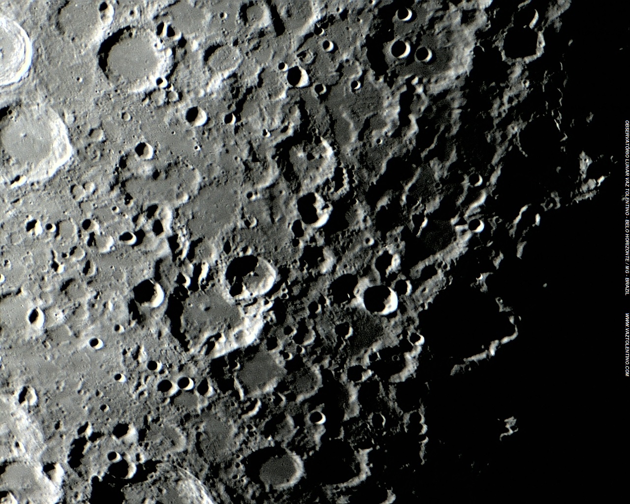 Foto: A cratera GOODACRE (diâmetro: 46 Km, profundidade: 3,2 Km, LAT: 32° 42′ 00″ S, 14° 06′ 00″ E) localizada nas terras altas cravejadas de crateras do quadrante sudeste lunar. Essa cratera homenageia o selenógrafo WalterGoodacre (1856 – 1938). Foto executada com apenas 1 frame em 16 de junho de 2013, 19:49:54 (22:49:54 UT).