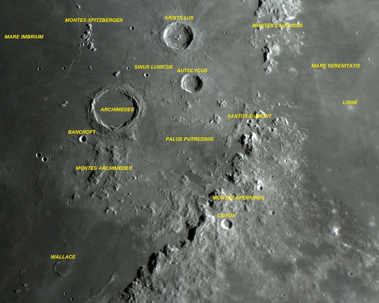 Imagem: Foto (Norte para baixo) da grande Cratera ARCHIMEDES e dos Montes Spitzbergen. A bela imagem panorâmica foi capturada pela sonda lunar japonesa Kaguya / Selene.