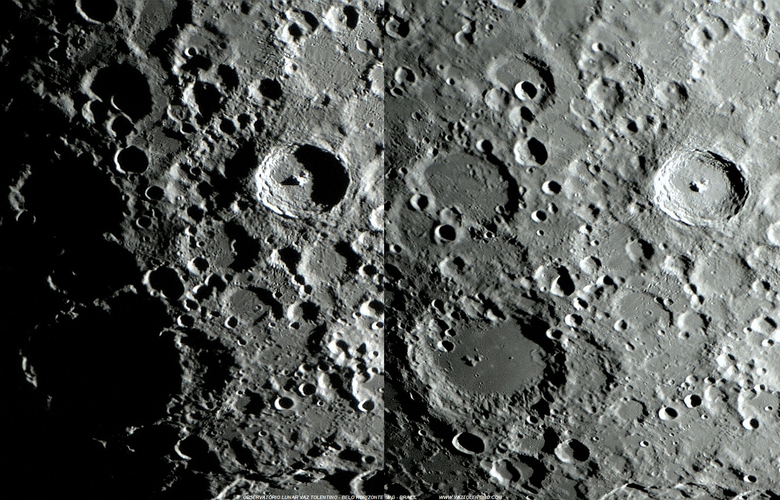 Foto: Composição mostrando a cratera TYCHO recebendo a luz solar vinda do leste (manha lunar - foto maior) e vinda do oeste (entardecer lunar - foto menor). Observe na foto menor a longa sombra criada pela montanha central de TYCHO. A grande e proeminente cratera CLAVIUS com seus 225 Km de diâmetro é vista ao sul de TYCHO. Foto maior executada em 30 de maio de 2012, 21:34:18 e foto menor em 27 de março de 2011, 05:35:02. Fotos executadas porVTOL - apenas 1 frame.