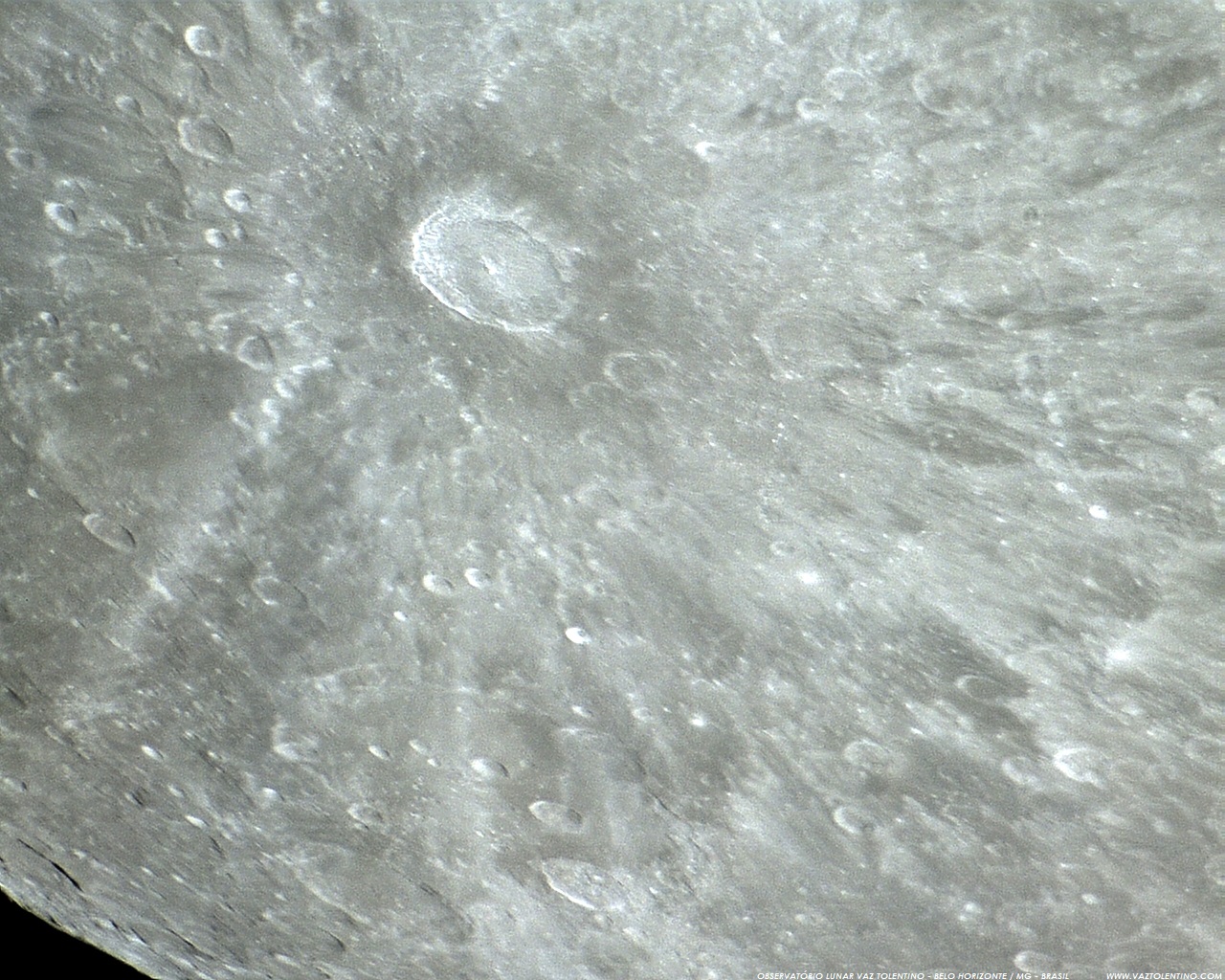 Foto: Na Lua cheia os raios brilhantes de TYCHO e de outras crateras jovens ficam destacados. TYCHO possui o sistema o maior sistema de raios brilhantes da face visível da Lua. Porém, observe que os raios são quase ausentes no lado oeste, indicando que a formação da cratera TYCHO ocorreu através de um impacto oblíquo de um cometa ou asteróide. Foto por VTOL.