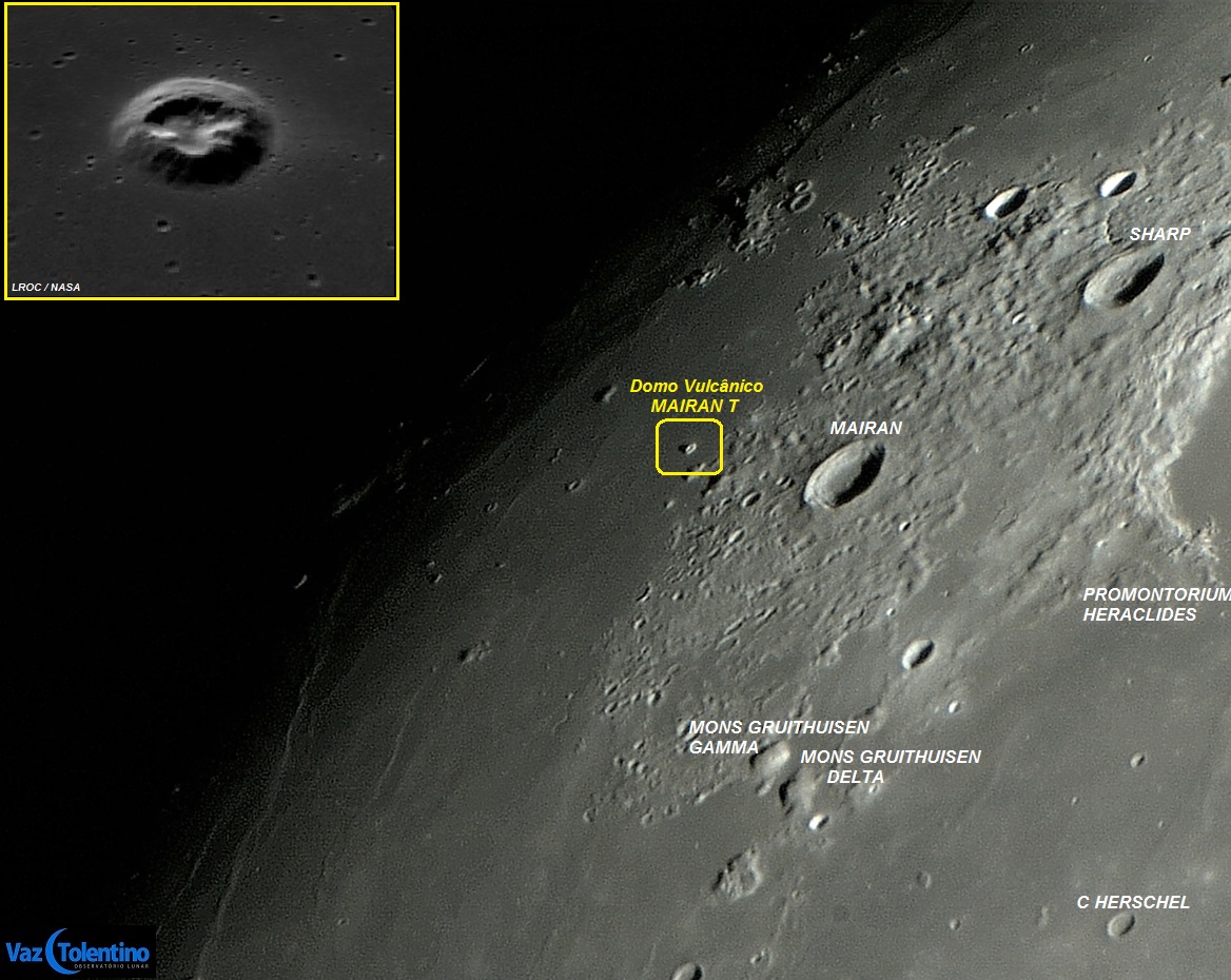 "Dome Mairan T" é um antigo vulcão lunar, que apresenta cone muito brilhante e destacado (alto albedo). Sua superfície clara indica que esse domo vulcânico foi formado por lavas ricas em sílica que são diferentes e muito mais viscosas do que o basalto escuro tradicional, rico em ferro, existentes nos mares lunares.