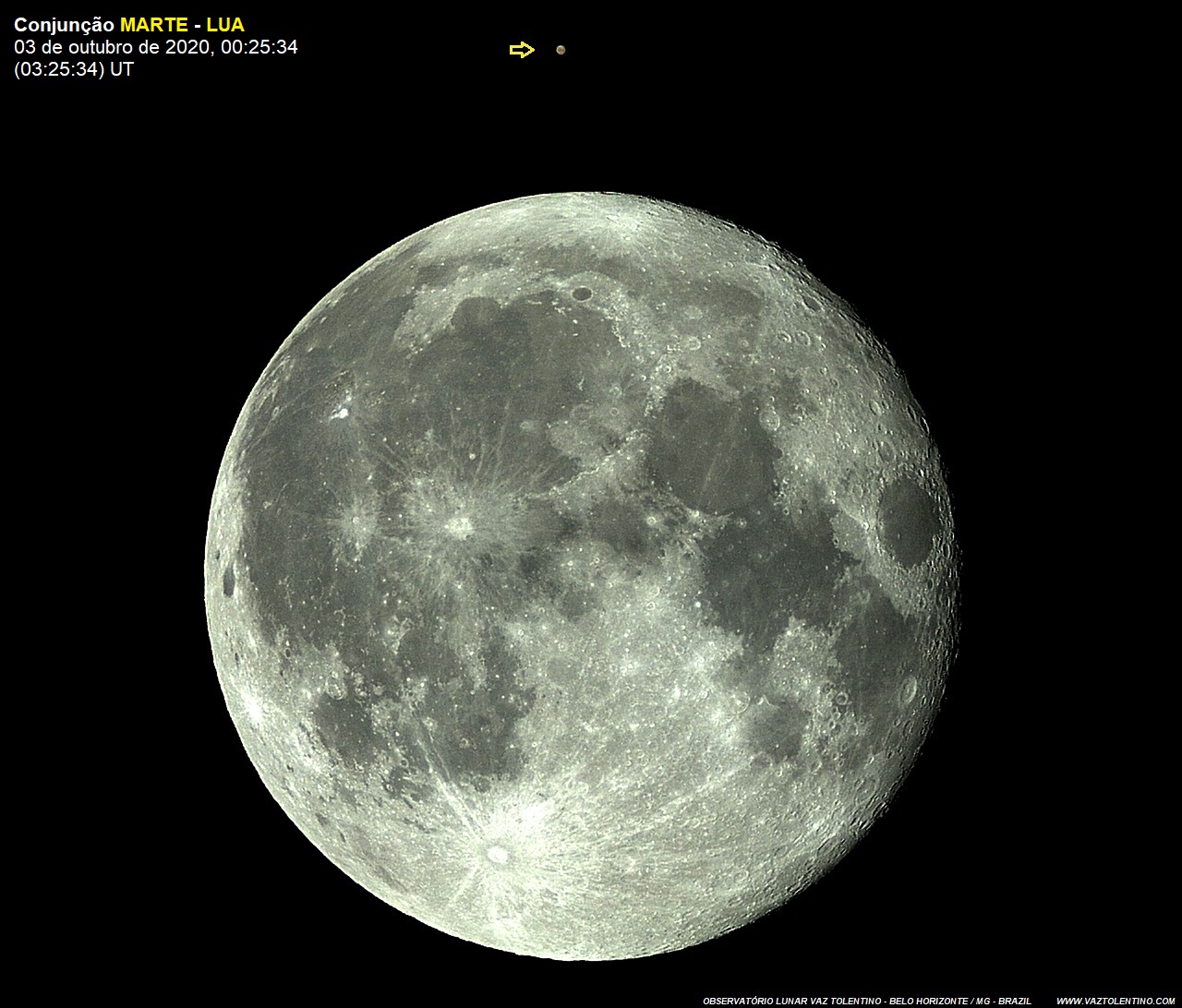 - Dia 3, a partir do ponto de vista do nosso Observatório Lunar aqui em Belo Horizonte / MG, registramos uma bela “conjunção Lua – Marte”. Porém, para os expectadores presentes nas localidades do extremo sul do Brasil, Argentina, sul do Chile e região sul da África, esse mesmo evento celeste se concretizou mais interessante, como "ocultação de Marte pela Lua".