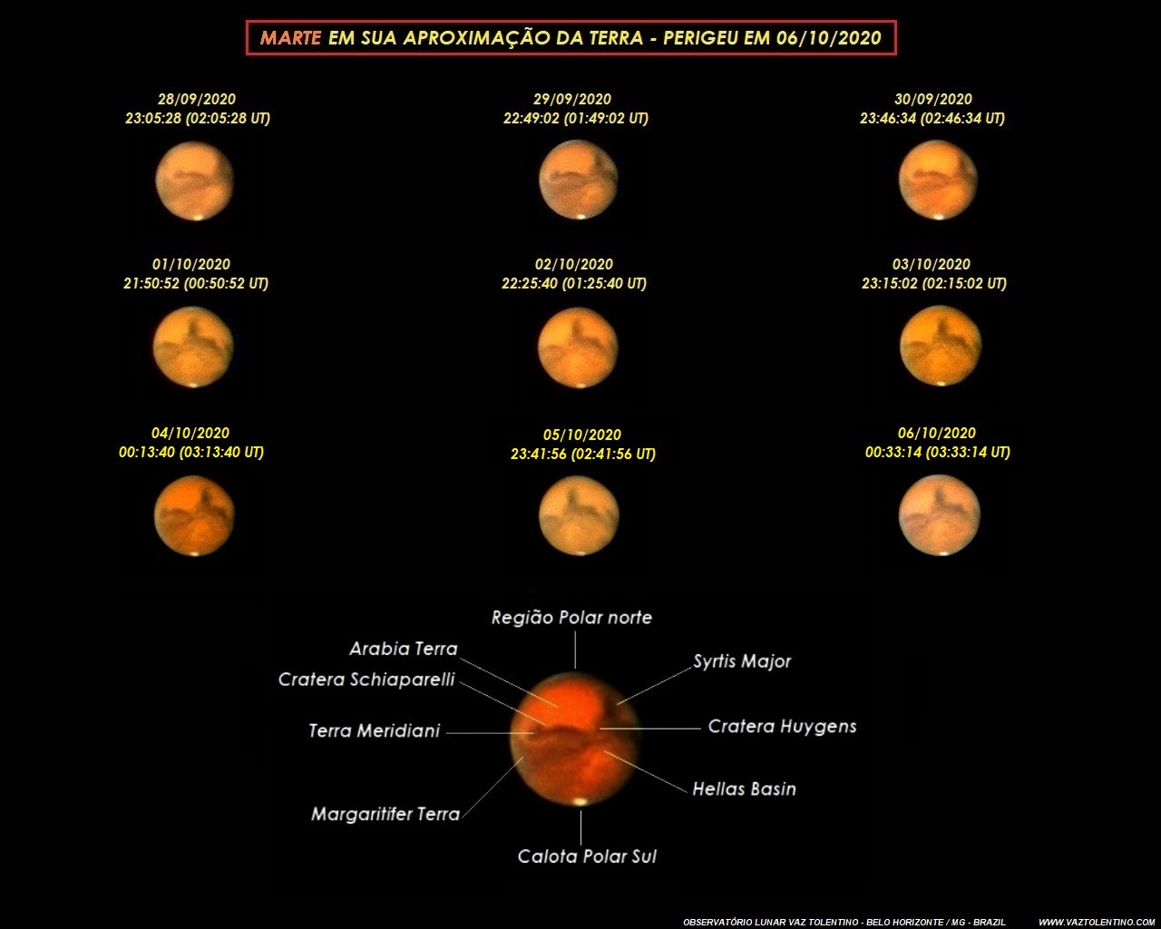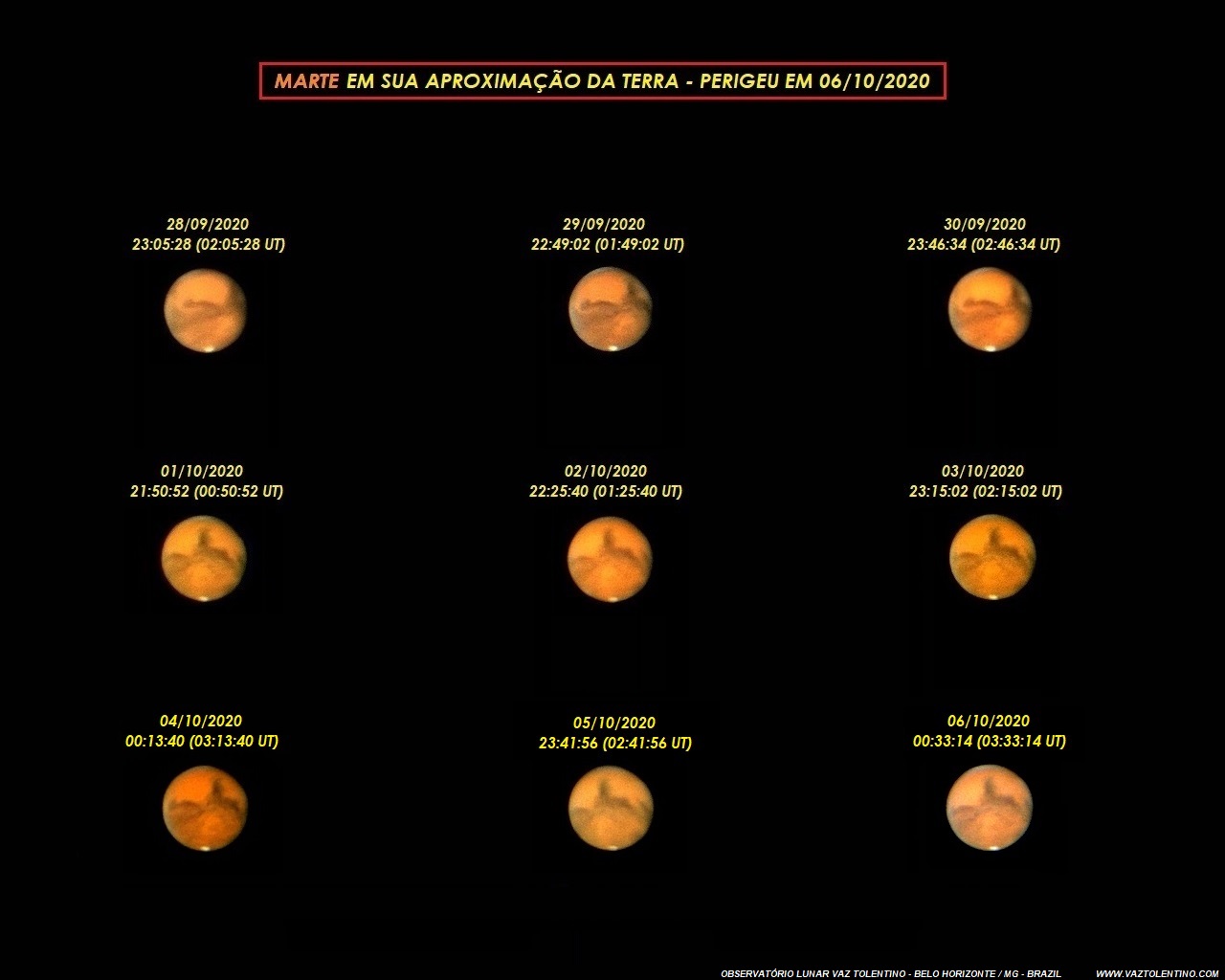 - Dia 6, quando Marte esteve mais próximo da Terra, fenômeno celeste conhecido como perigeu. De acordo com a NASA, o perigeu 2020 ocorreu às 14:00 UT, quando Marte esteve localizado numa distância de 62,07 milhões de km ou 0,41 UA da Terra, o que fez o planeta vermelho parecer mais brilhante e maior. Nessa situação, Marte apresentou um tamanho de disco máximo em torno de 22,6 segundos de arco, brilhou com magnitude -2,6 e estava na constelação de Peixes. Durante a aproximação para o perigeu, o hemisfério sul de Marte com sua calota polar estava bem visível. Como Marte leva cerca de 22,9 meses para orbitar o SOL, Terra e Marte se aproximam a cada (quase) dois anos, com a distância entre os planetas variando a cada vez (mais abaixo, fotos da aproximação de Marte).