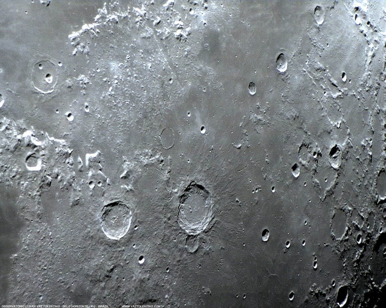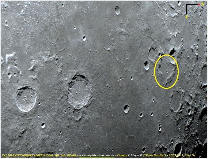 O Vaz Tolentino Observatório Lunar (www.vaztolentino.com.br) capturou a imagem da cratera C. Mayer D mostrada abaixo, a qual carinhosamente foi “batizada” como “Terra Brasilis”, no dia 22/02/2011, às 02h31m, hora local (4 dias após a Lua Cheia).