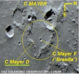 C. Mayer D apresenta um formato muito semelhante ao mapa do Brasil, inclusive com a presença de um impacto central, que criou a cratera C. Mayer F (coordenadas selenográficas Lat: 62.0º N , Long: 19.5º E), com 9 Km de diâmetro e 1,2 Km de profundidade, justamente na posição de Brasília.