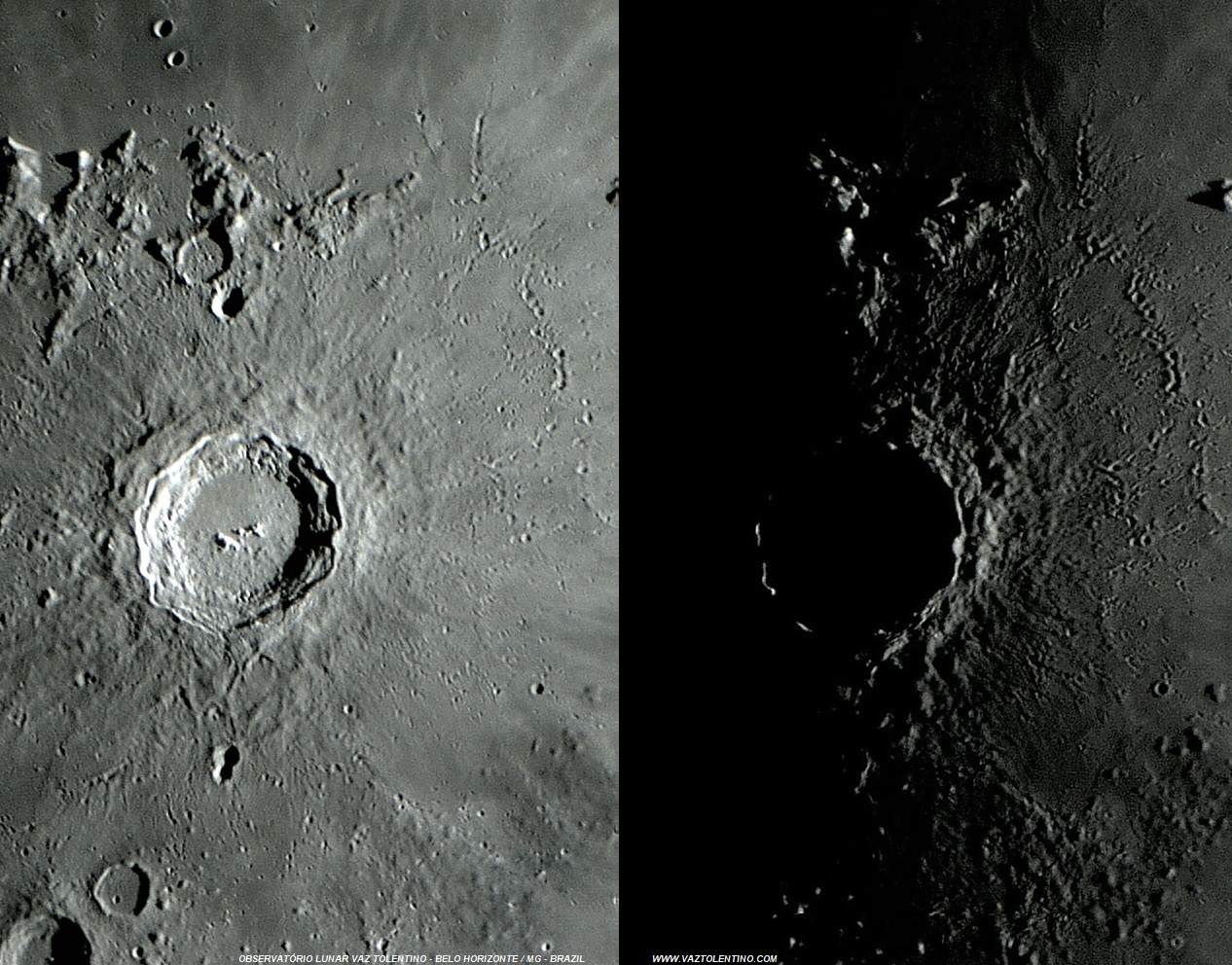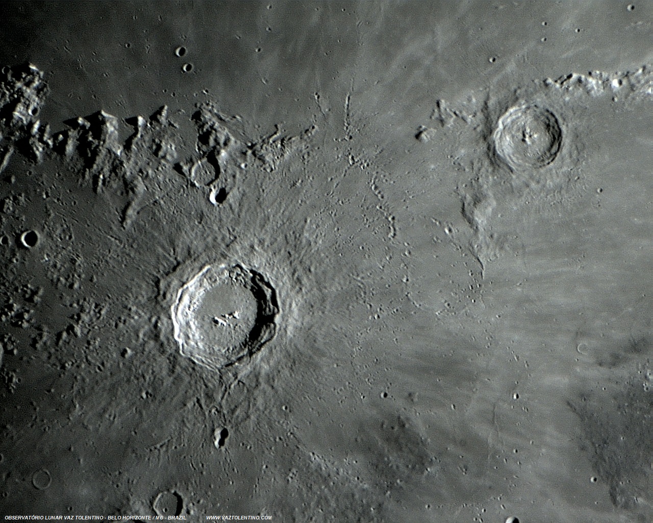Foto: Pouco antes das fases quarto crescente e quarto minguante, COPERNICUS fica inteiramente preenchida por sombra negra, parecendo um grande buraco sem fundo. A foto mostra também as inúmeras crateras secundárias criadas pelos escombros ejetados pelo impacto que criou COPERNICUS. Foto executada por VTOL em 29 de maio de 2012, 20:10:10.