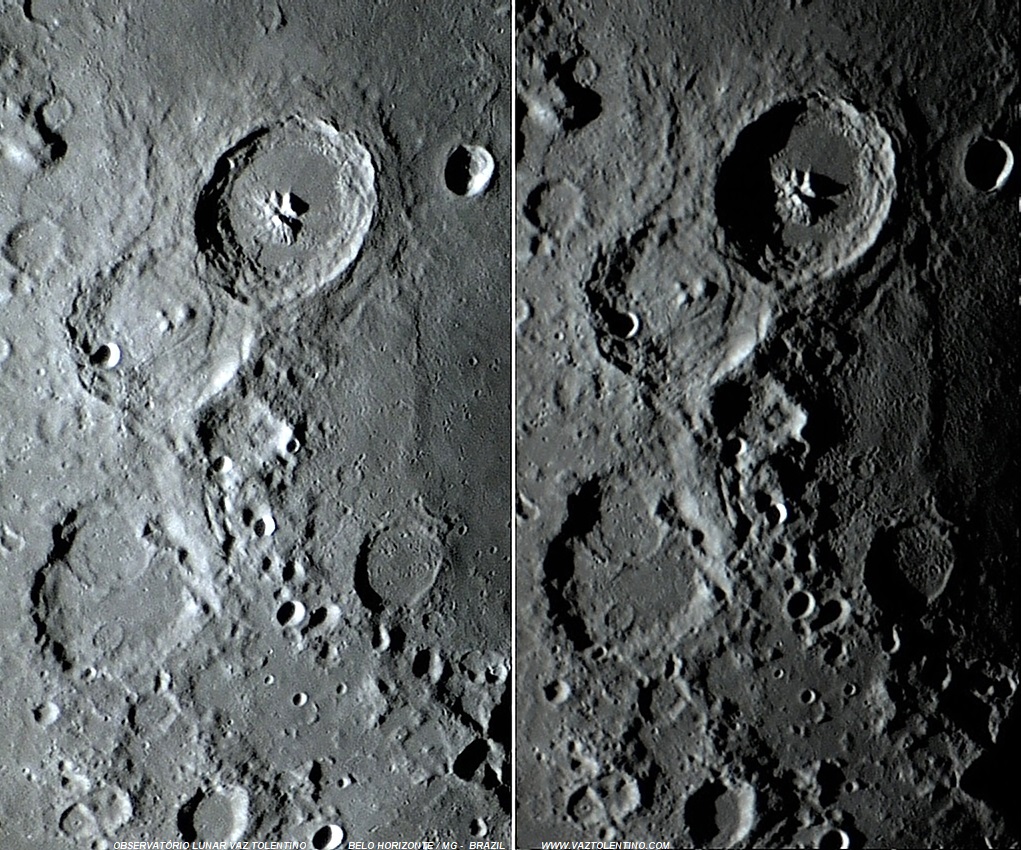 Não é monótono observar a Lua. Alguns exemplos da ação direta do efeito visual causado pela "dupla dinâmica" luz e sombra, por sobre as formações lunares, são mostradas nesta composição fotográfica. Na multipla imagem, algumas crateras estão no amanhecer e outras no entardecer lunar.