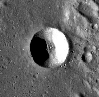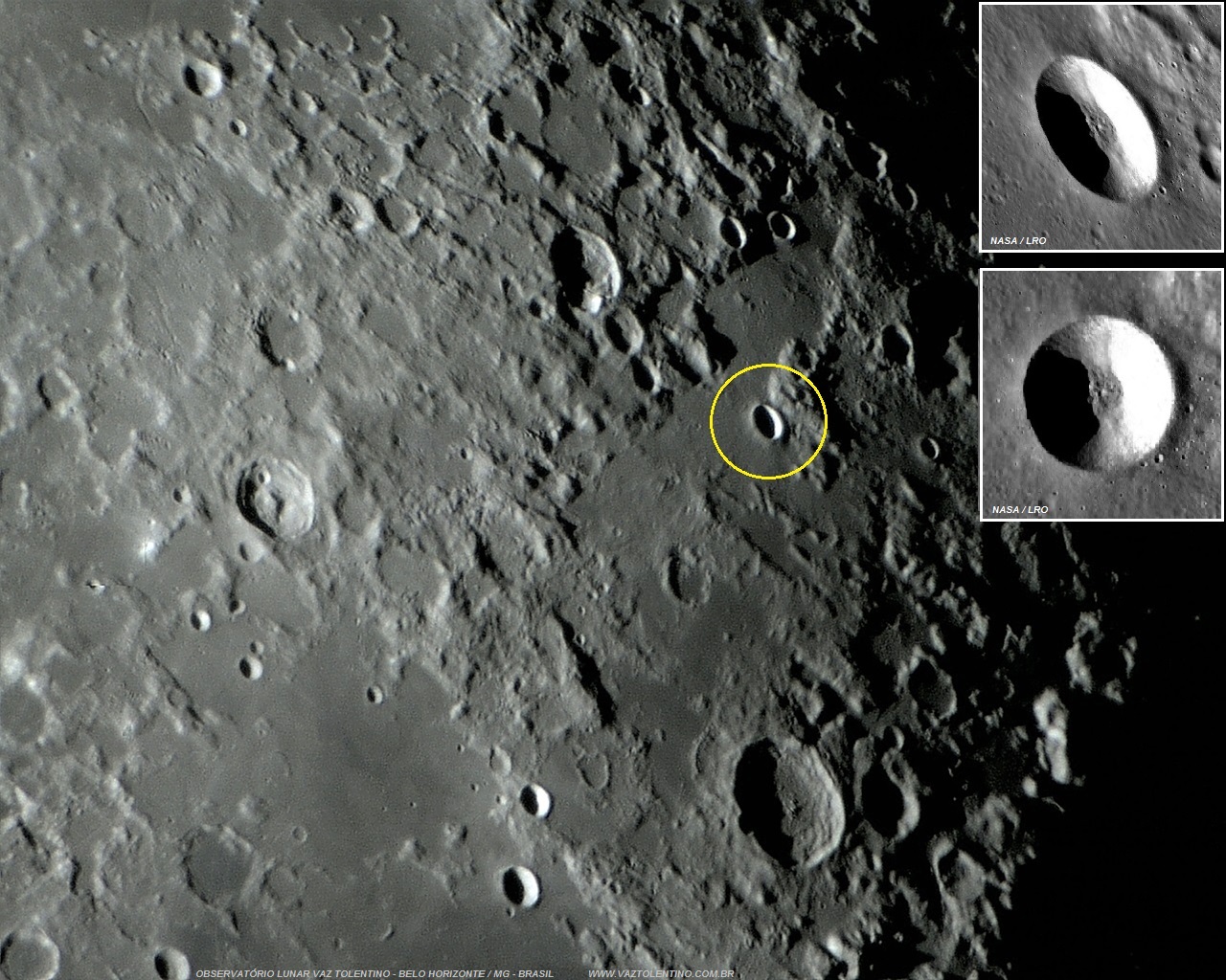 Imagem: Apesar de o nosso ponto de vista aqui da Terra nos fazer enxergar a cratera Tralles A de forma alongada ou elíptica, na realidade seu aro é perfeitamente circular e suas bordas afiadas. Foto orbital - NASA / LRO.