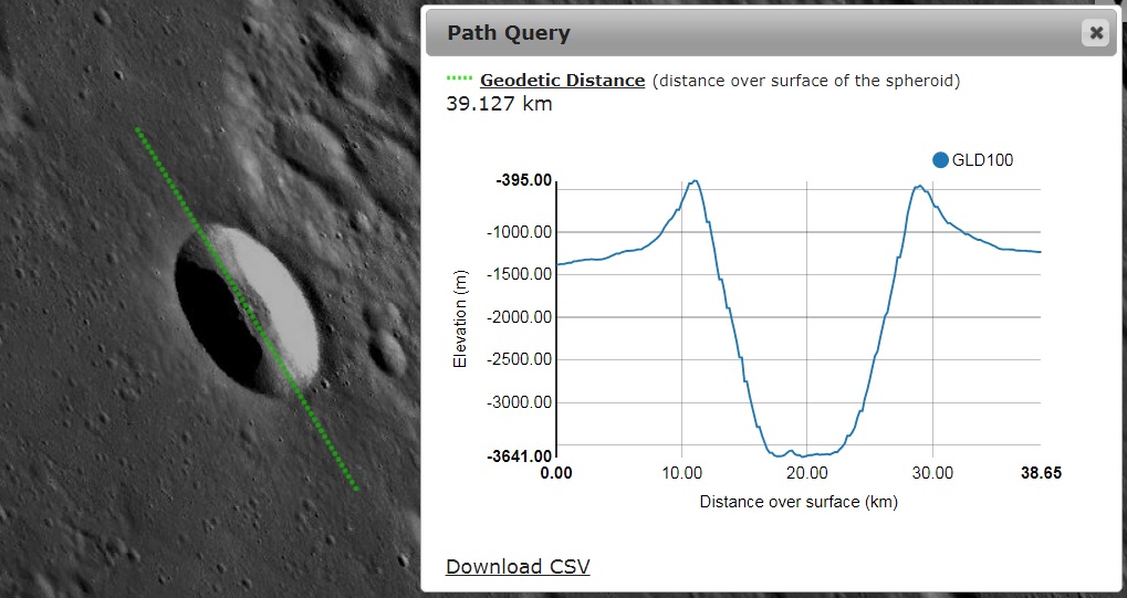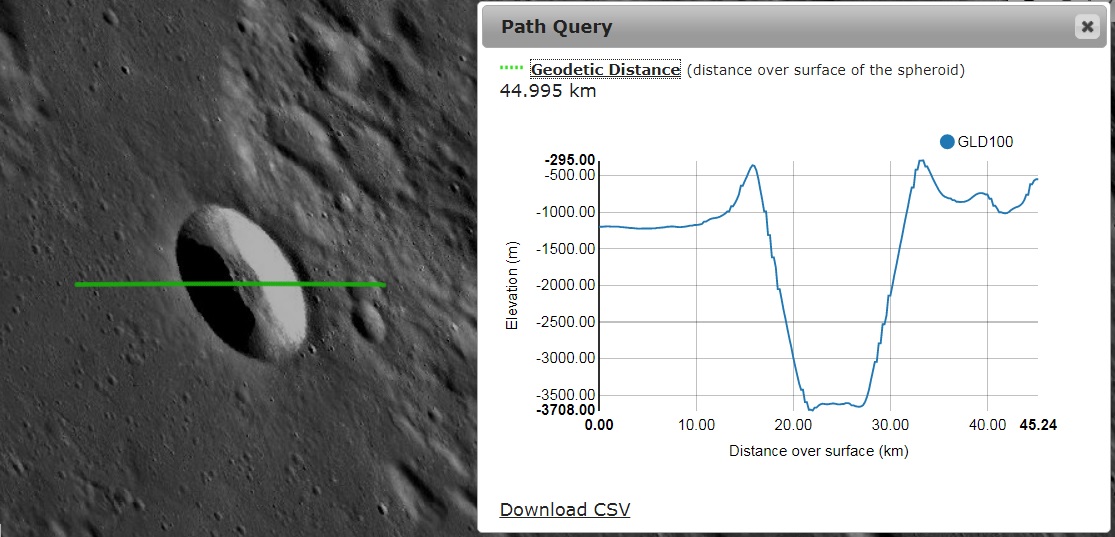 Imagem: O Perfil Altimétrico NW - SE da pequena, porém profunda, cratera Tralles A - NASA / LRO QuickMap.