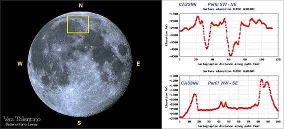Composição: Foto da Lua cheia mostrando a região da fotografia apresentada da cratera CASSINI. Dois perfis altimétricos de CASSINI também foram traçados. Foto por VTOL, Perfis altimétricos por NASA / LRO QuickMap..