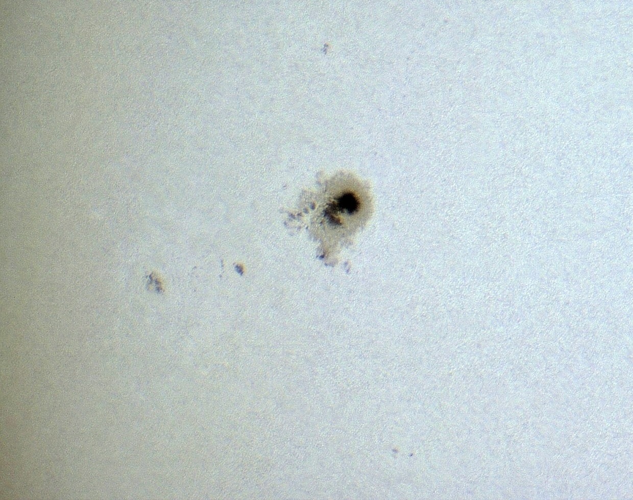 Imagem: A grande região ativa AR2786 e sua companheira, a AR 2785. Foto executada com apenas 1 frame (filtro Baader luz visível) em 27 de novembro de 2020, 10:02:34 (13:02:34 UT).