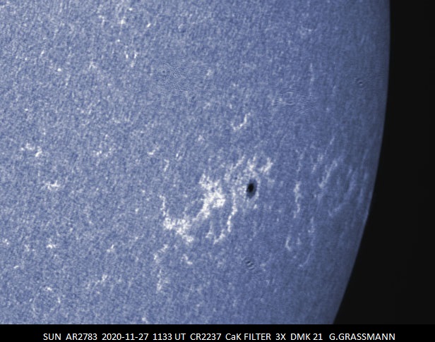 Imagem: A grande área de abrangência (1000 MH) da Região Ativa AR 2786 e seu grupamento de manchas solares - Foto por VTOL feita com apenas 1 frame (filtro Baader luz visível) em 27 de novembro de 2020, 08:42:48 (11:42:48 UT).