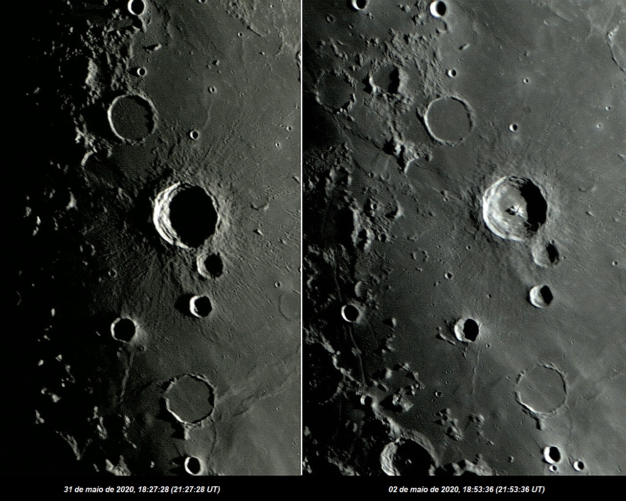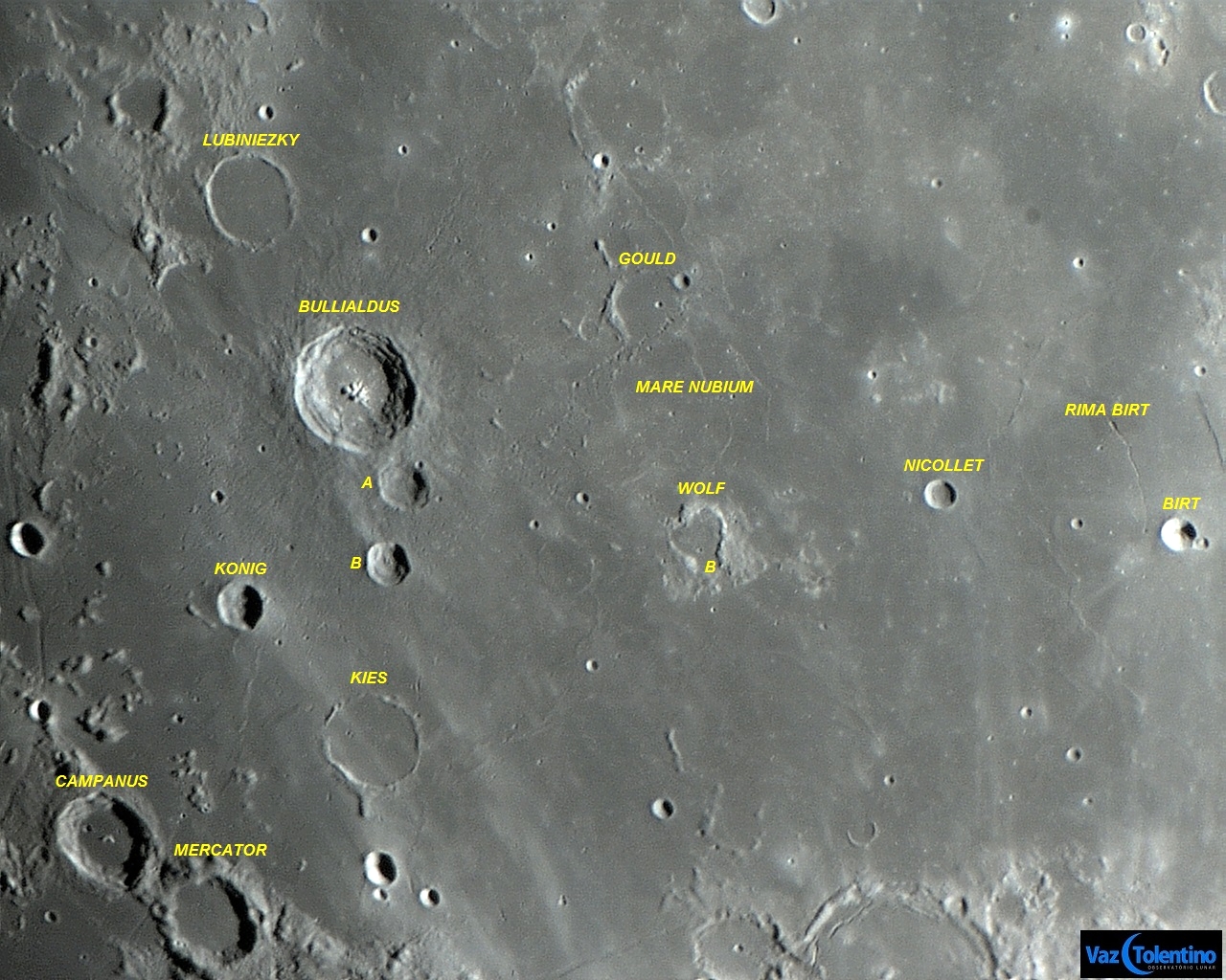 Foto: Composição apresentando a Lua cheia com a região de abrangência da foto, o perfil altimétrico da cratera BULLIALDUS e, nas fotos principais, a proeminente cratera BULLIALDUS em dois tempos. Primeiro com o Sol no leste (foto superior) e depois com o Sol a oeste (foto inferior). Em ambas as fotos a montanha central de BULLIALDUS mostra alta taxa de albedo. Fotos executadas por VTOL em 10 de julho de 2011, 20:03:08 (foto superior) e 27 de março de 2011, 05:30:42 (foto inferior).