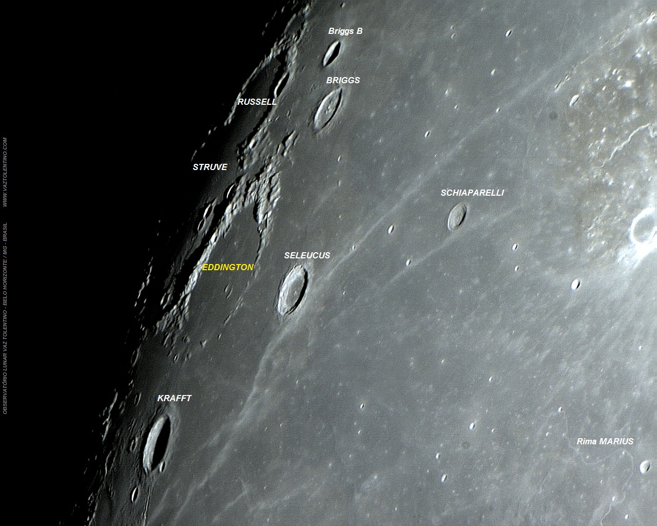O melhor período para observação da cratera EDDINGTON é no sexto dia após à fase quarto-crescente ou no quinto dia após o quarto-minguante.