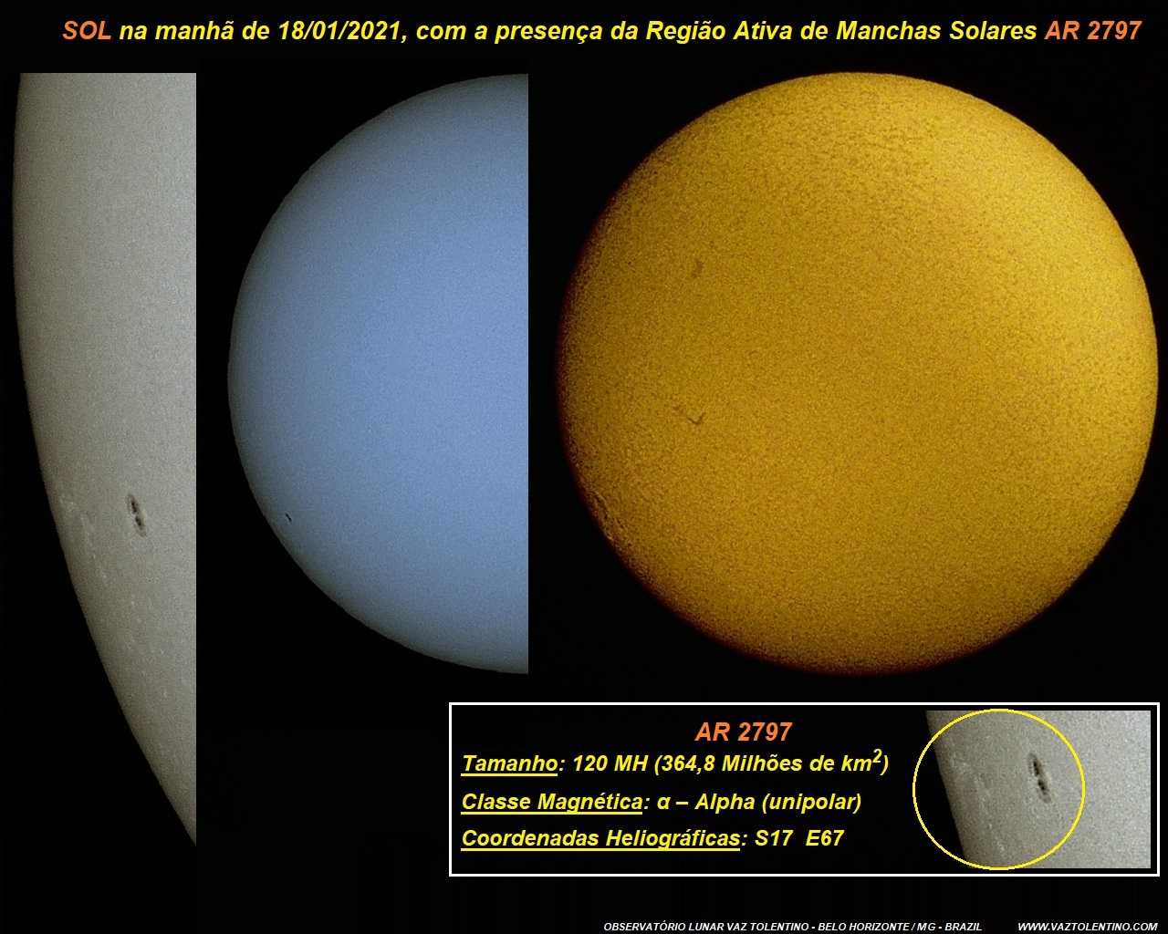 A nova Região Ativa de Manchas Solares AR 2797, pertencente ao Ciclo Solar 25, apareceu no limbo do quadrante sudeste solar do hemisfério visível do Sol em 17/01/2021, quando apresentava tamanho de 90 MH (273,6 Milhões de km2).