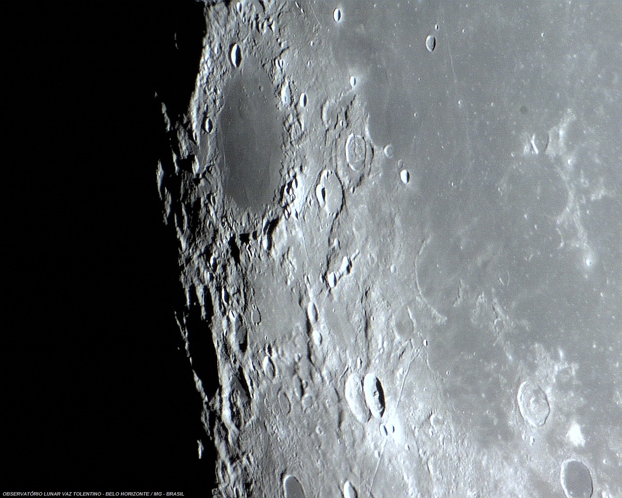 Foto: A grande e destacada cratera GRIMALDI, próxima do limbo oeste lunar, com seus 230 Km de diâmetro, que na verdade é o anel interno de uma grande bacia de impacto, conhecida como Bacia GRIMALDI, cujo anel externo tem cerca de 430 Km de diâmetro. Foto executada por VTOL em 03 de junho de 2012, 01:41:14.