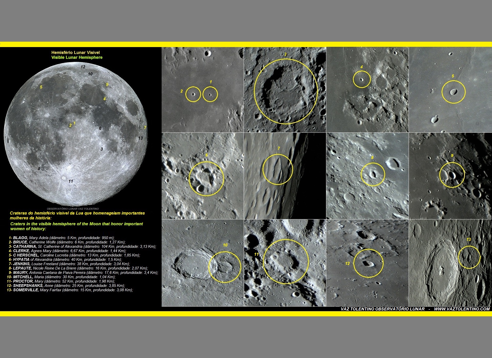 Publicamos hoje, um mosaico com as 13 crateras do hemisfério visível lunar que homenageiam personalidades femininas importantes.