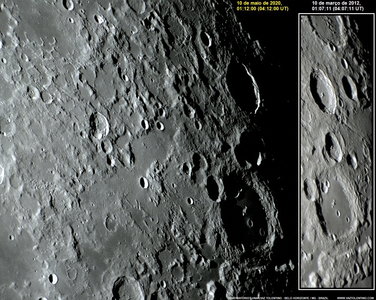 Composição fotográfica: Foto da esquerda: 10 de maio de 2020, 01:12:00 (04:12:00 UT). Foto da direita: 10 de março de 2012, 01:07:11 (04:07:11 UT).