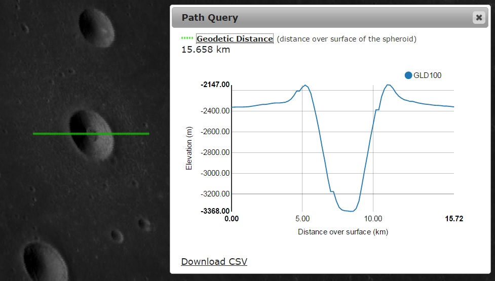 Baseado nas medições que fizemos nas três crateras utilizando o perfil altimétrico do LRO QuickMap, chegamos às seguintes dimensões: