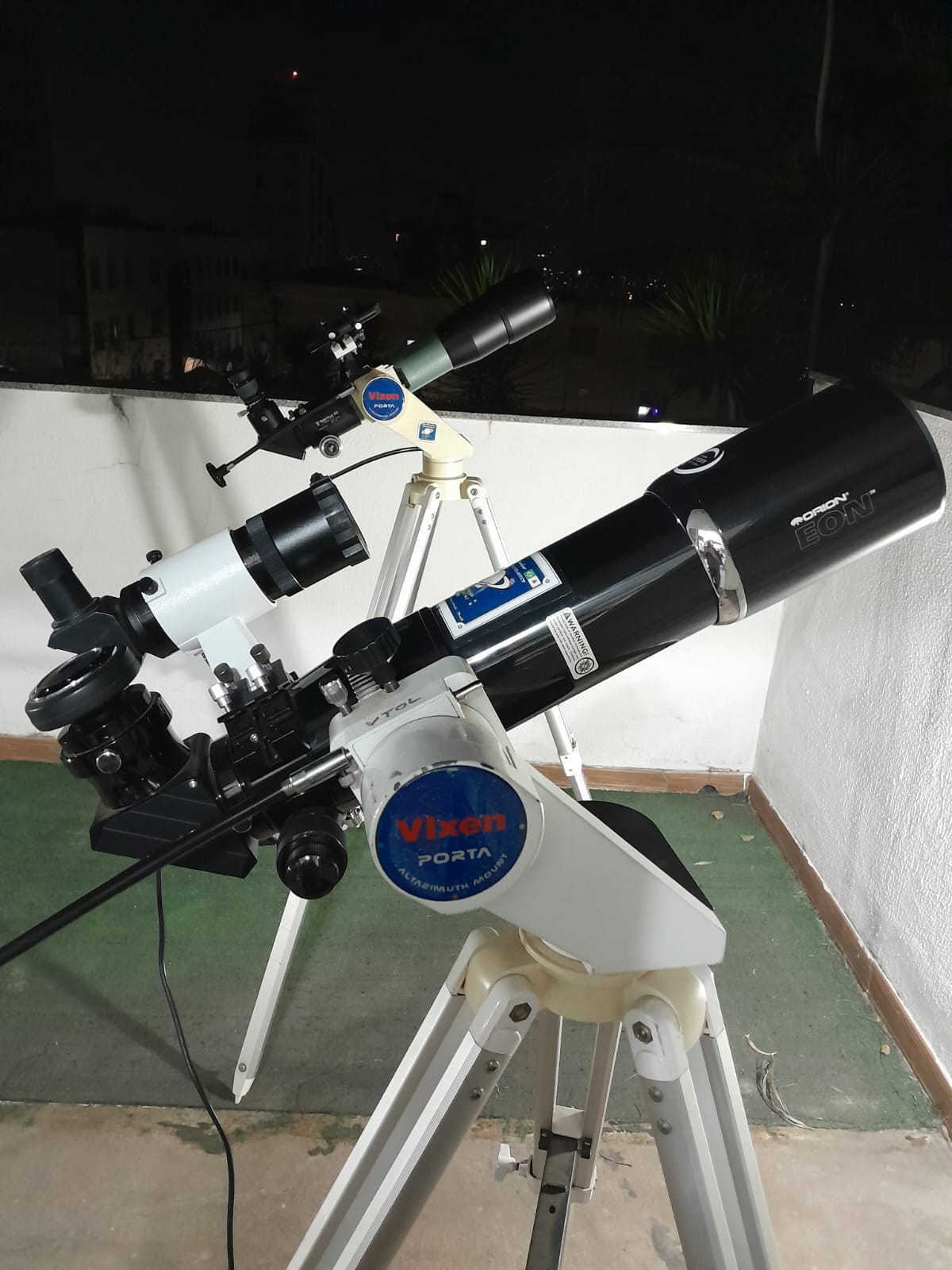 SOL e LUA fotografados com o mesmo conjunto Telescópio e Câmera. (telescópio refrator ORION Eon 80mm ED APO, câmera ORION StarShoot Solar System IV e montagem Alt-Azimutal VIXEN Porta). Fotos de frame único: