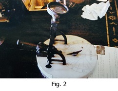 O mesmo G. Gandolfi já havia construído um outro Relógio de Sol com canhão, porém com a latitude de + 44º 14’ 38” N calculada para a Itália. São, pois, dois Relógios de Sol com canhão, um comemorativo e outro para funcionar. Por último, estando em Paris em 2011, por acaso deparei com uma fotografia (Fig. 4) de uma jovem segurando um Relógio de Sol com canhão e, ao ver esta fotografia, veio-me a idéia de construir um semelhante, o que aconteceu em abril/maio de 2016.