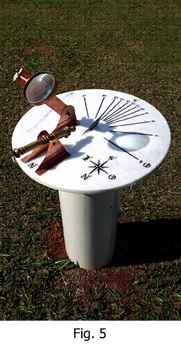 O Relógio de Sol por mim construído tem uma base em mármore branco (mesa) de 60 cm de diâmetro, um gnomôm de aço inoxidável, um canhão modelo Idade Média com 18 cm e uma lupa com 6 cm de diâmetro. O canhão foi doado pelo colega de São Paulo, Luigino Drioli e as gravações foram feitas pelo meu amigo Valdemar G. T. Neto de Americana, SP. O Relógio de Sol está calculado para latitude de -22º 42’ 30”.9 S que é do Observatório Astronômico de Piracicaba Elias Salum, órgão da Secretaria Municipal de Educação onde está instalado (Fig. 5).