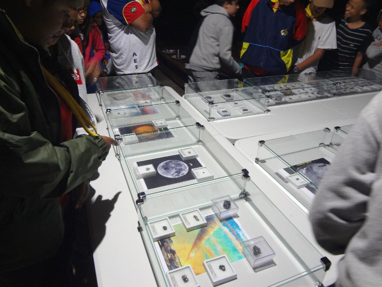 Na exposição de Meteoritos, estavam à mostra peças interessantes, como pedaços de rochas da Lua, de Marte e do Asteroide Vesta, além de pedaços do Meteorito de Chelyabinsk, que caiu na Rússia em 2013, do Meteorito que criou a cratera Barringer no Arizona/EUA, do Meteorito Sikhote-Alin, que caiu na Rússia em 1947 e de belas peças de Meteoritos Siderólitos Pallasitos (mistos - metal e olivinas).