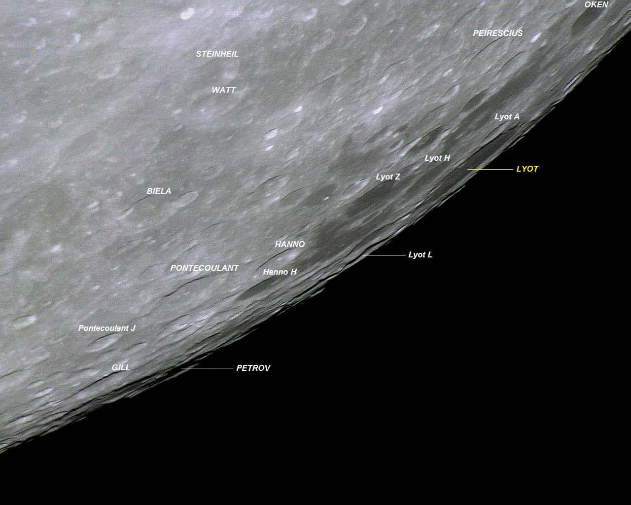 Por estar localizada na zona de librações, próximo do limbo sudeste lunar e do Mare AUSTRALE, a cratera LYOT apresenta-se elíptica a partir do nosso ponto de vista com ângulo baixo aqui da Terra.