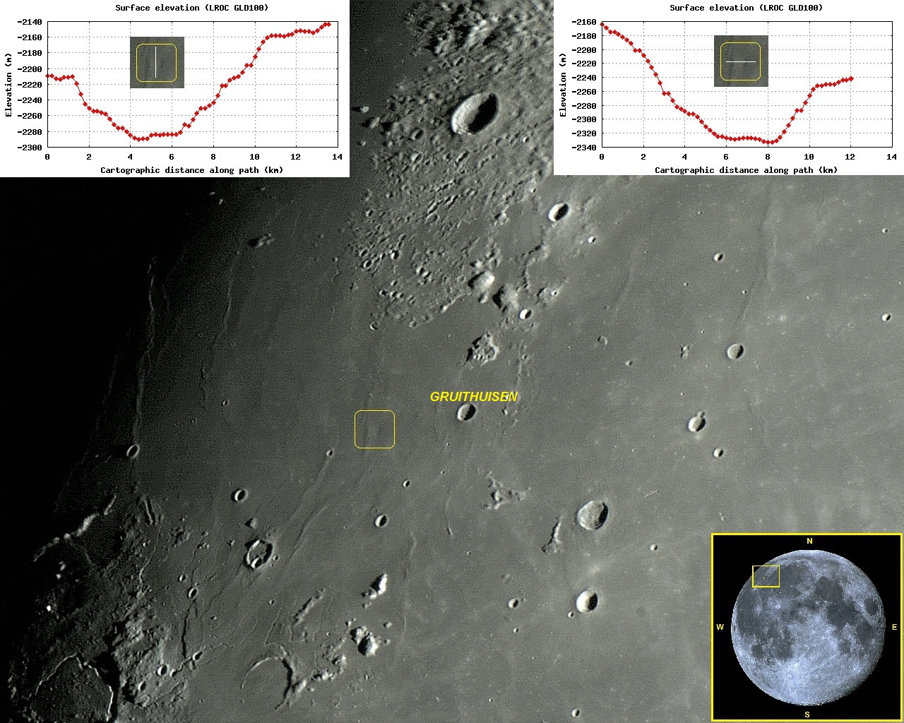 Foto: Provável cratera fantasma no norte do Oceanus PROCELLARUM, a sudoeste da cratera GRUITHUISEN. Os perfis altimétricos nas direções N – S e W – E mostrando as concavidades, também são apresentados (LRO QuickMap). Foto executada por VTOL em 21 de maio de 2013, às 22:45:18.