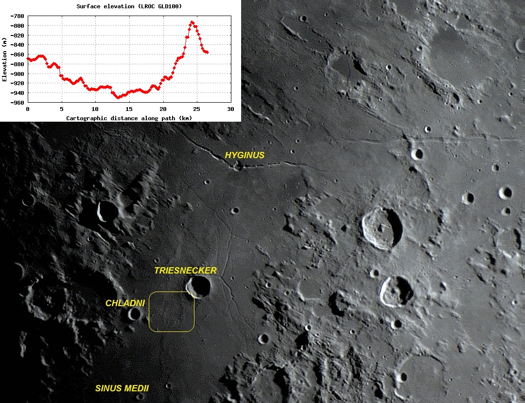 Foto: A provável cratera fantasma localizada nas lavas do Sinus MEDII, junto à borda sudoeste de TRIESNECKER e a leste de CHLADNI. O perfil altimétrico no sentido W – E também é apresentado. Foto executada por VTOL em 24 de agosto de 2012, 19:25:02.