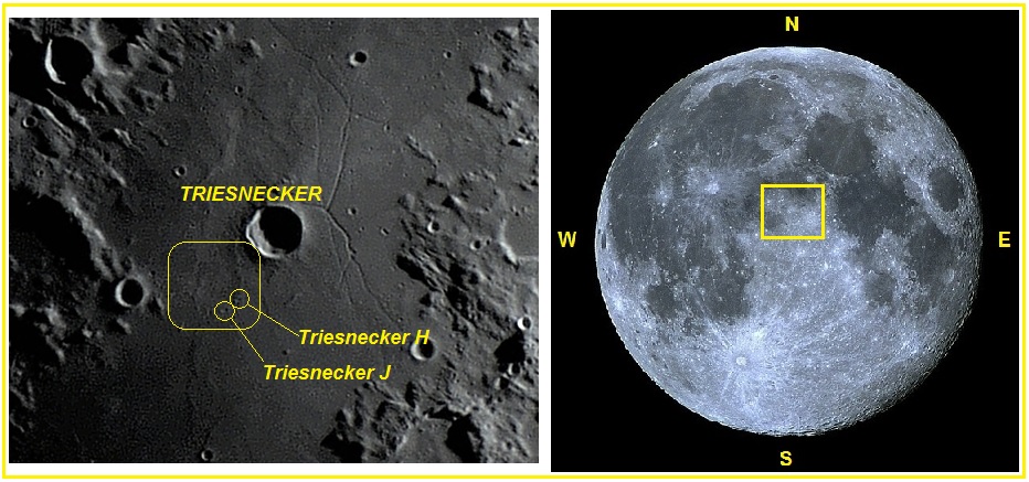 Ilustração: A localização da foto e as minúsculas crateras Triesnecker J (diâmetro: 3,3 Km) e Triesnecker H (diâmetro: 2,5 Km) localizadas por sobre o aro da suposta cratefa fóssil - VTOL.