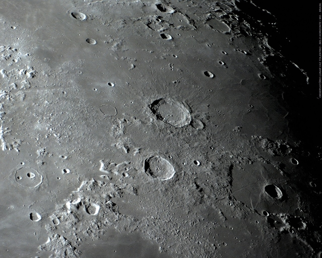 Foto: O belo par de crateras ARISTOTELES e EUDOXUS. A leste vê-se o Lacus MORTIS e, em seu interior, a cratera BÜRG. Foto executada em 22 de fevereiro de 2011, 02:31:08.