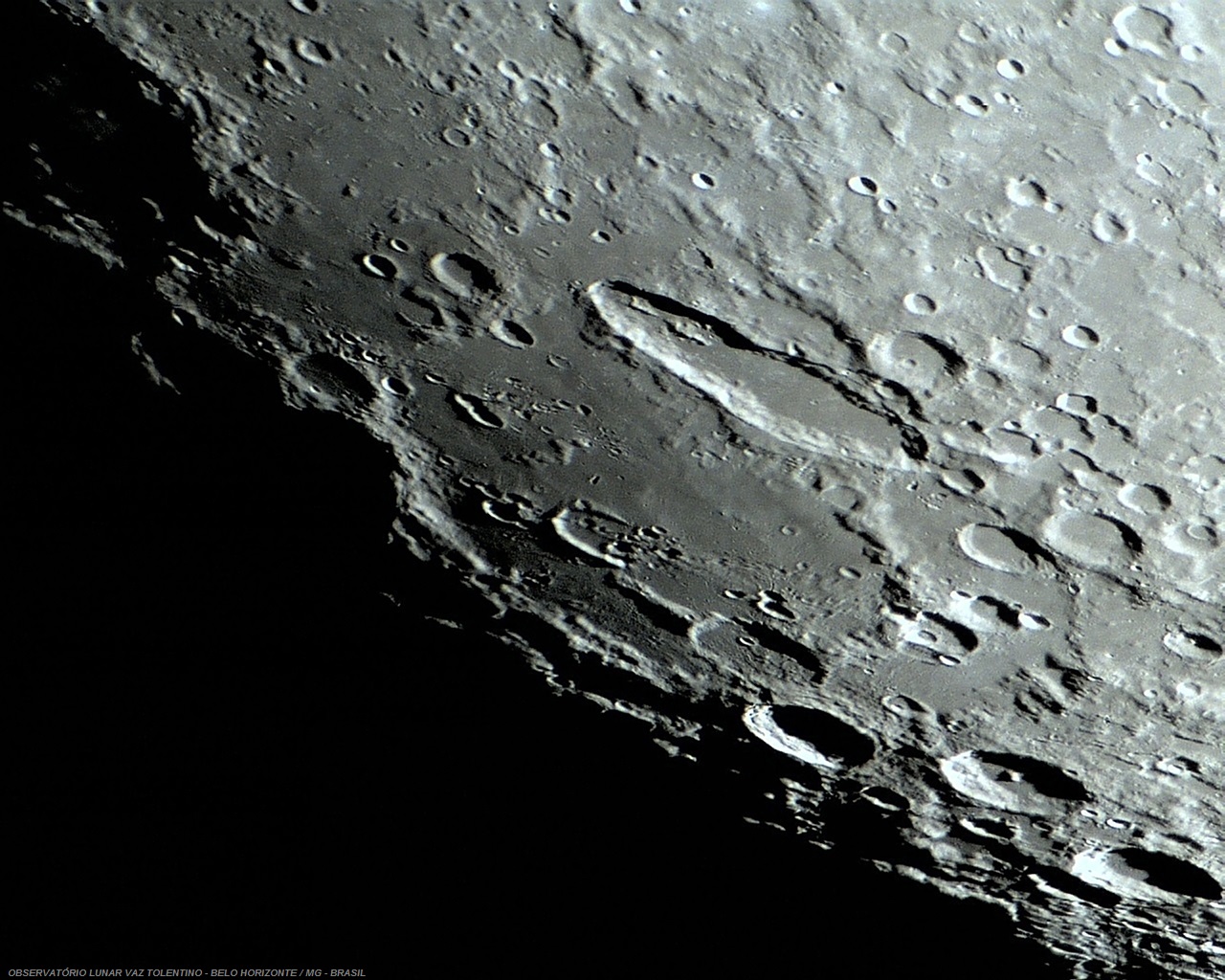 Foto: Os arcos concêntricos em amarelo estão representando parte dos anéis da bacia NECTARIS. O mar de lavas propriamente dito (Mare NECTARIS) concentrou-se apenas na área interna do anel central. Os anéis da bacia foram suplantados por impactos subsequentes, que “camuflaram” suas existências, sobrando apenas algumas pistas, como a grande escarpa curvilínea Rupes ALTAI (480 Km de extensão), na borda do arco maior. Norte para direita. Foto executada com apenas 1 frame em 22 de fevereiro de 2011, 02:28:22.