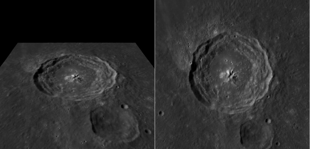 Composição fotográfica: A cratera BULLIALDUS fotografada em voo orbital pela sonda lunar robótica LRO da NASA.