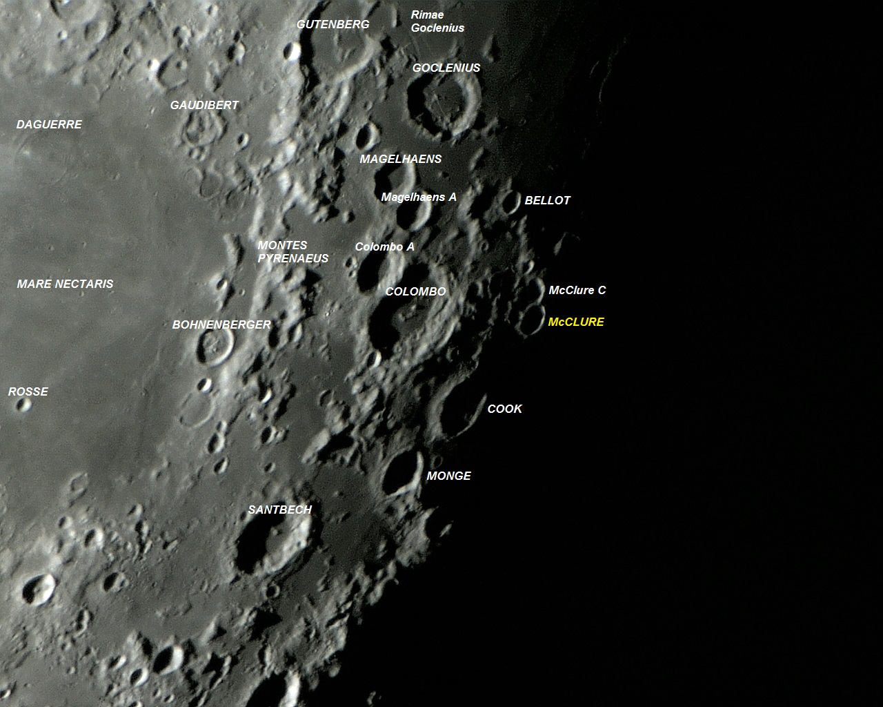 McCLURE caracteriza-se como uma formação circular de encostas íngremes, aro com bordas afiadas e relativamente conservadas ou pouco erodidas, localizada na região que fica a oeste do Mare NECTARIS, a cerca de 60 Km a oeste da cratera COLOMBO (diâmetro: 79 Km, profundidade: 2,53 Km). As coordenadas selenográficas de McCLURE são: LAT: 15° 18′ 00″ S e LON: 050° 18′ 00″ E.