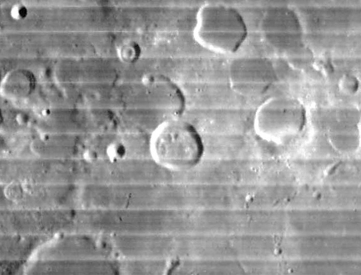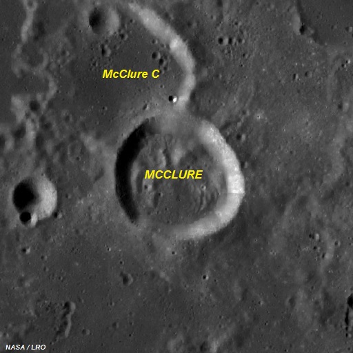 Foto: A região da cratera McCLURE fotografada pela sonda robótica americana Lunar Orbiter 4 da NASA. Observe ao norte de McClure C, a pequena cratera de aro duplo (Crozier H) com 11 Km de diâmetro.