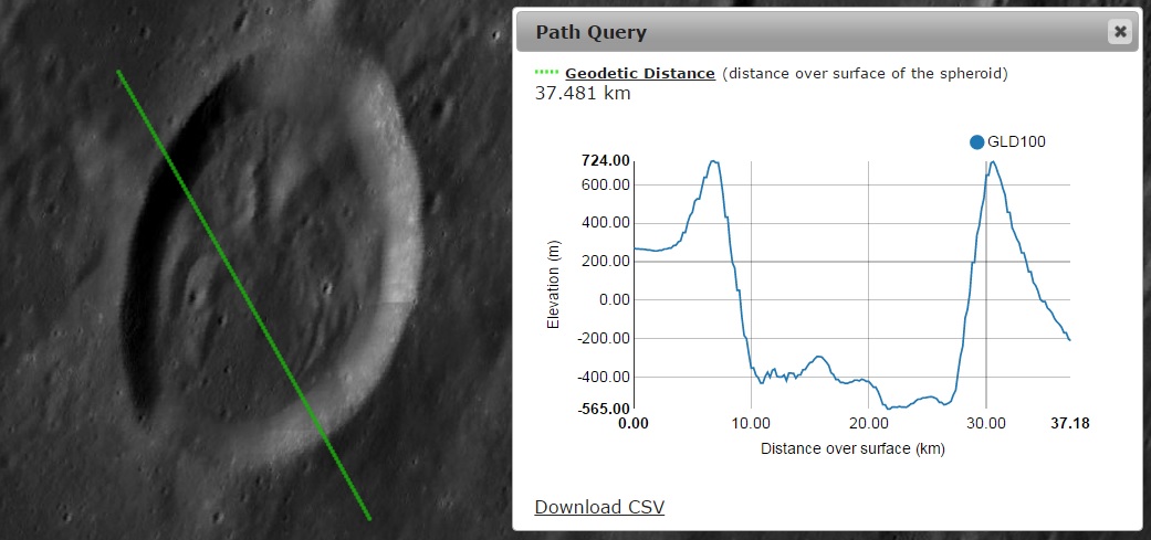 Imagem: O perfil altimétrico NW - SE da cratera McCLURE - LRO QuickMap.